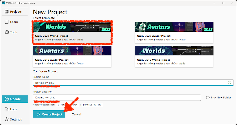 First, create a Unity project for your world using VCC. Select and enter the settings as shown below, and then click the “Create Project” button.