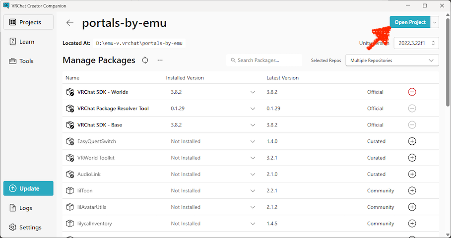 *1 If the project name or path contains non-alphanumric characters, such as Emoji or Japanese, errors may occur. If your Windows username includes Japanese characters, it’s best to create a path that uses only alphanumeric (ASCII) characters, such as C:\Work, and save the project there.*2 You can set the world name later, so think of this as the folder name of your Unity project.