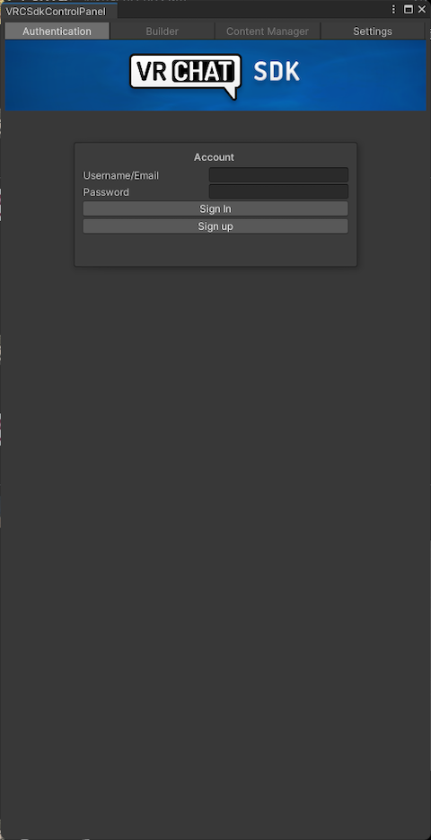 The “VRCSdkControlPanel” should appear, so enter your username and password to sign in.
