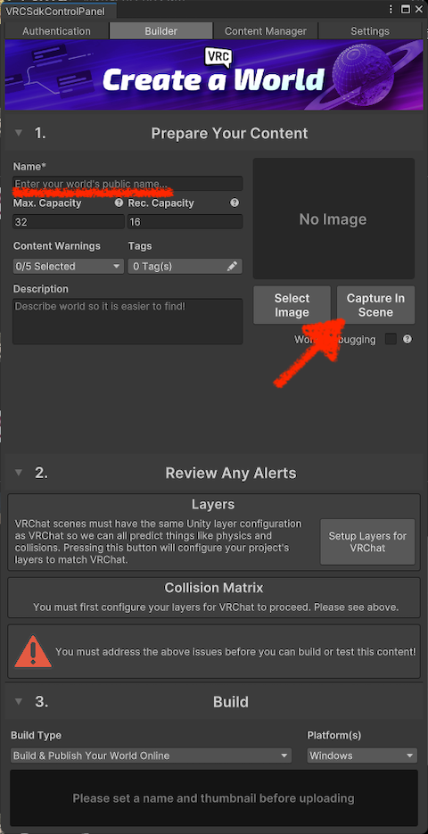 Take a screenshot of your world with “Capture In Scene,” and enter your world’s display name in “Name.” You can use Japanese and other languages here.