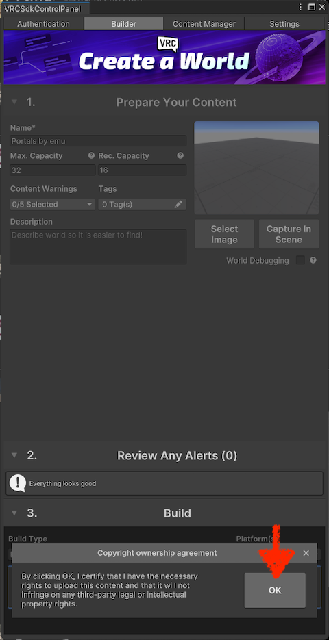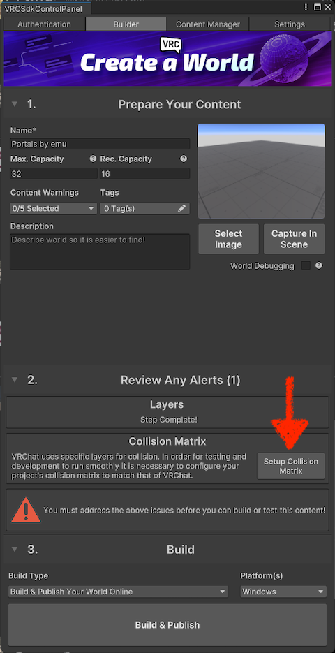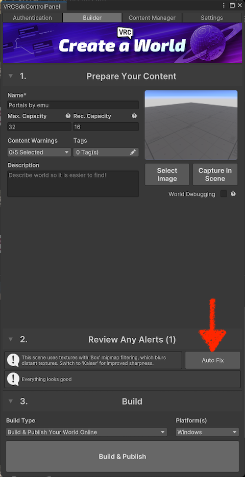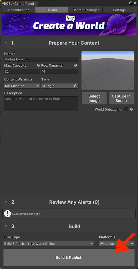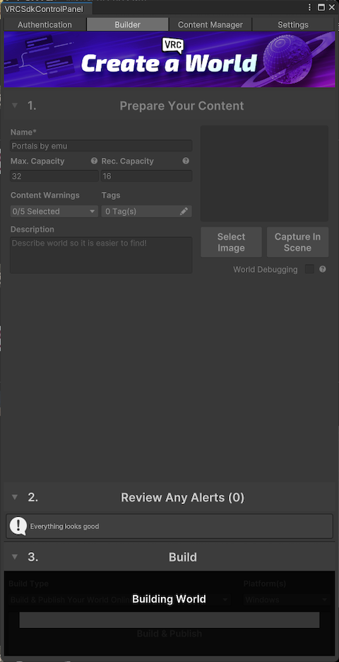 Once you’ve signed in to VRChat from the “VRCSdkControlPanel,” the “Builder” tab will look like this.