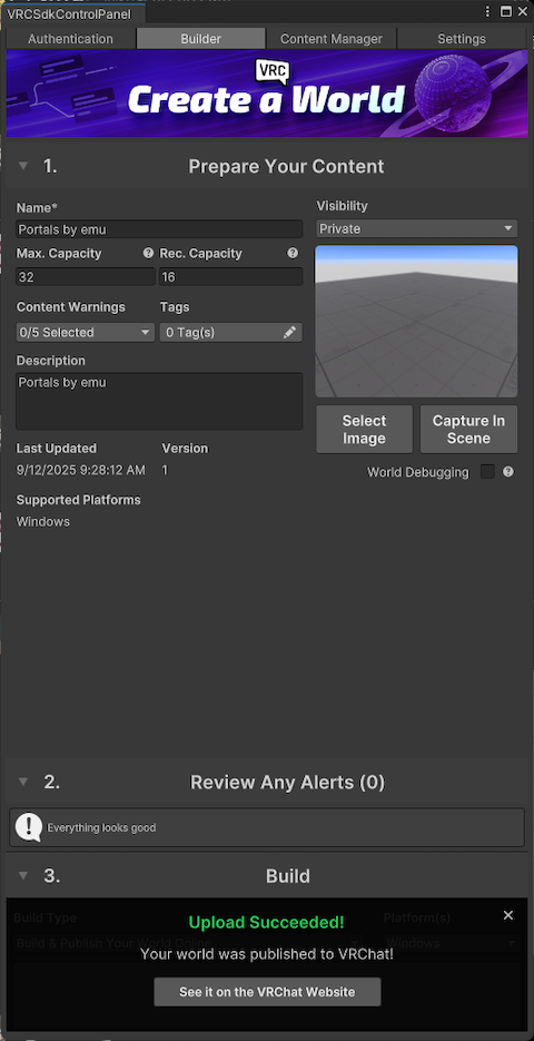 If the message “Upload Succeeded!” appears on the “VRCSdkControlPanel,” your upload was successful! 🎉