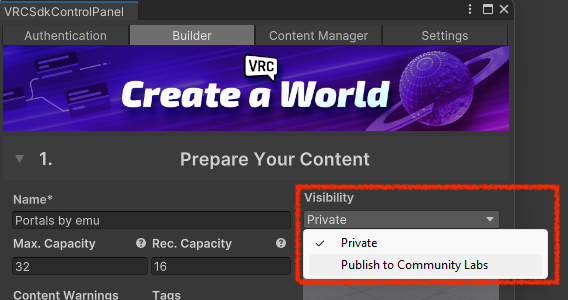 This time, you uploaded it as a “Private” world, but you can publish it to “Community Labs” by selecting “Publish to Community Labs” under “Visibility.”
