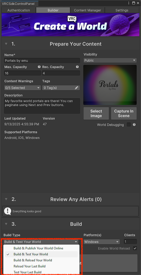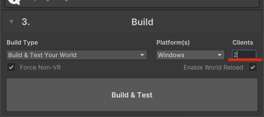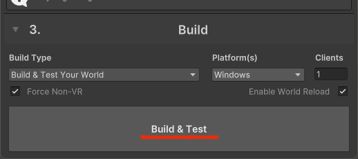 Change the “Build Type” in the familiar “VRCSdkControlPanel” to “Build & Test Your World.”